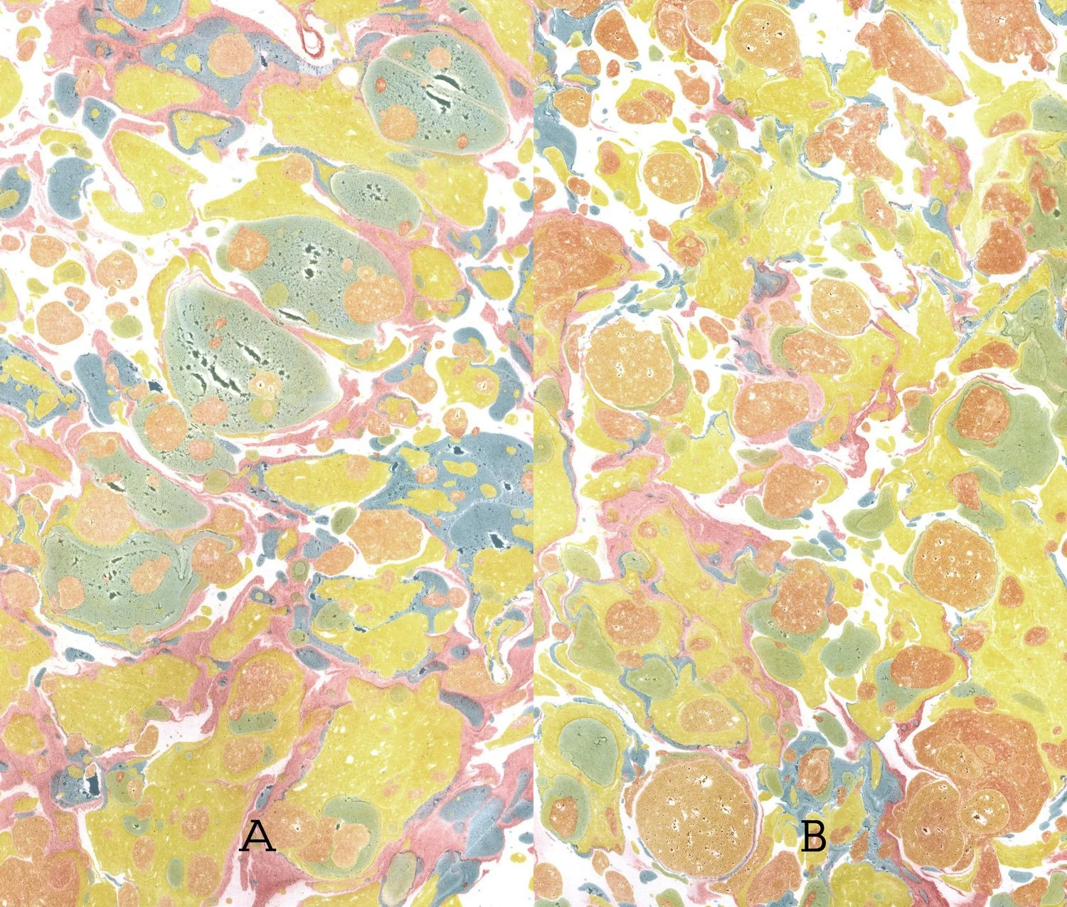Lakes are a class of historical, manmade pigments which include alum in their makeup. In centuries past, marblers utilized lake pigments for their beautiful hues and ease of printing.