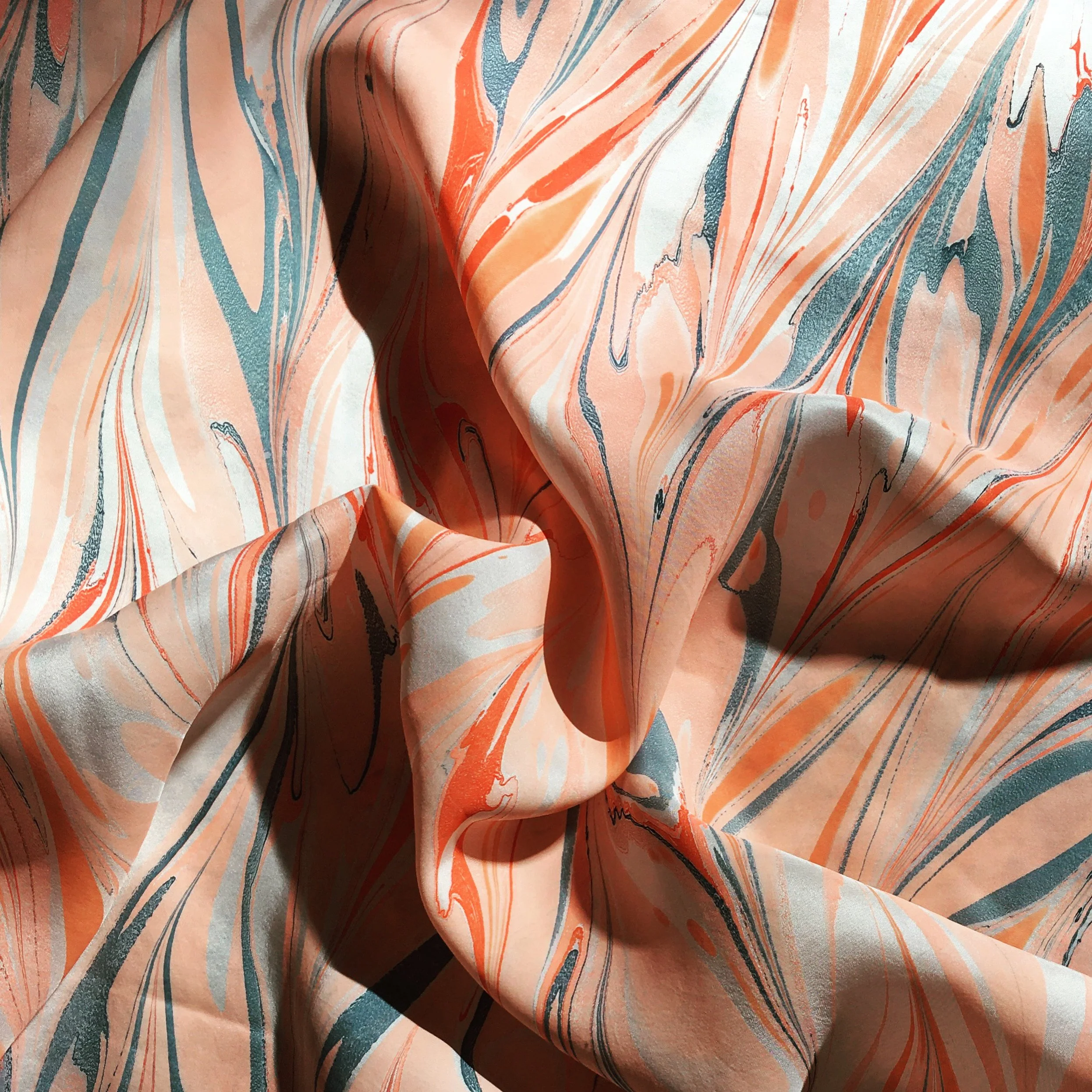 Firstly, choose an absorbent natural fiber or blend for your fabric. Thoroughly wash the fabric in very hot water with a pH neutral, fragrance-free detergent to remove any starch, sizing, or dirt from its surface - these will impede both the mordant and marbling from being absorbed.